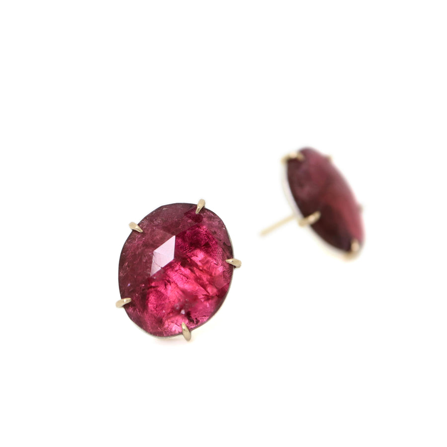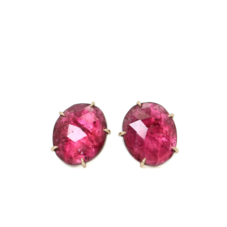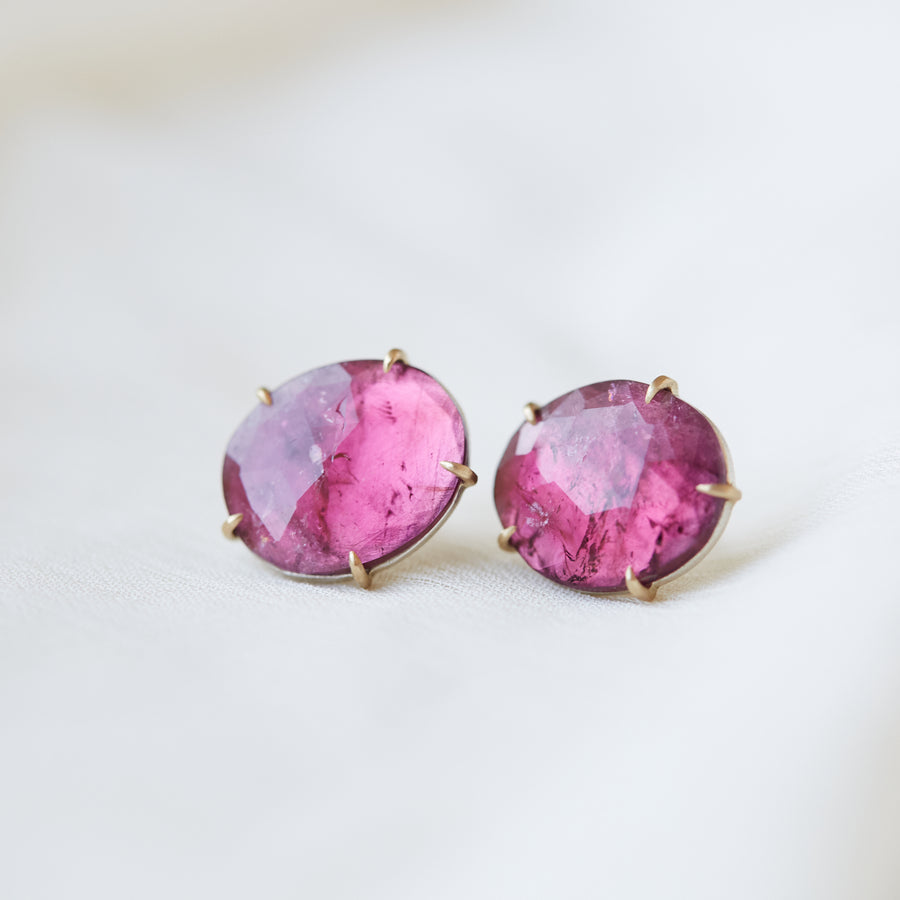 Sunset tourmalines glow with dusk hues and atmospheric striations under geometric facets and sharp Vanity prongs. These handcrafted studs combine contrasting fine metals to enhance the organic, vesper gemstones.