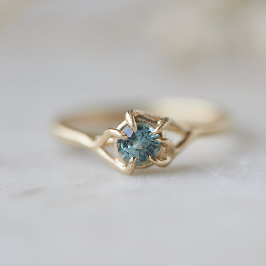 A crystal blue Montana sapphire sits within a gold ring, wrapped in a cradle of branches. The sapphire’s cool, translucent blue evokes the stillness of a mountain lake, its depth enhanced by the warmth of the gold.