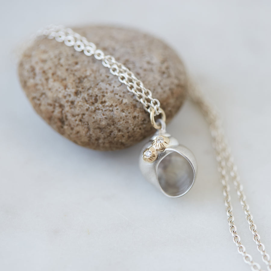 Fine metals and diamond-adorned, 14k gold barnacles enhance the intricacies and textures of a petit nautical pendant that hangs elegantly from a classic chain. The luminous beams of a waxing moon and its spiraled light can be found under the sea and in this handmade, moon snail shell necklace.