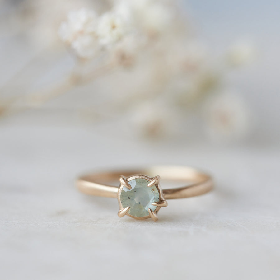 A lunar Montana sapphire shimmers with silk and speckles of deep ink, evoking the quiet mystery of the night sky. Like the ethereal glow of the full moon, this otherworldly gem is set in a ring of gold.