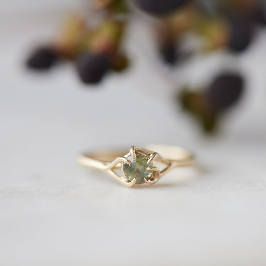 A sage green Montana sapphire rests within a gold ring, wrapped by delicate branching prongs that echo the organic beauty of nature. The gem’s muted green hues evoke quiet sunlight filtering through the morning fog of a forest, casting a soft, diffused glow.