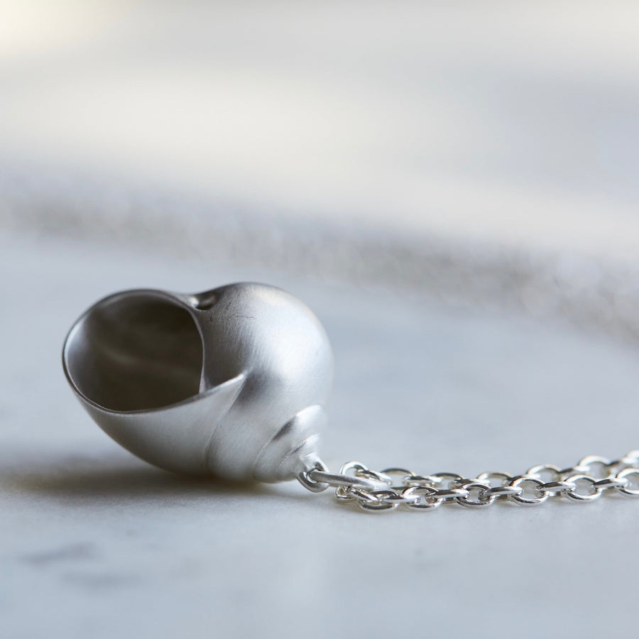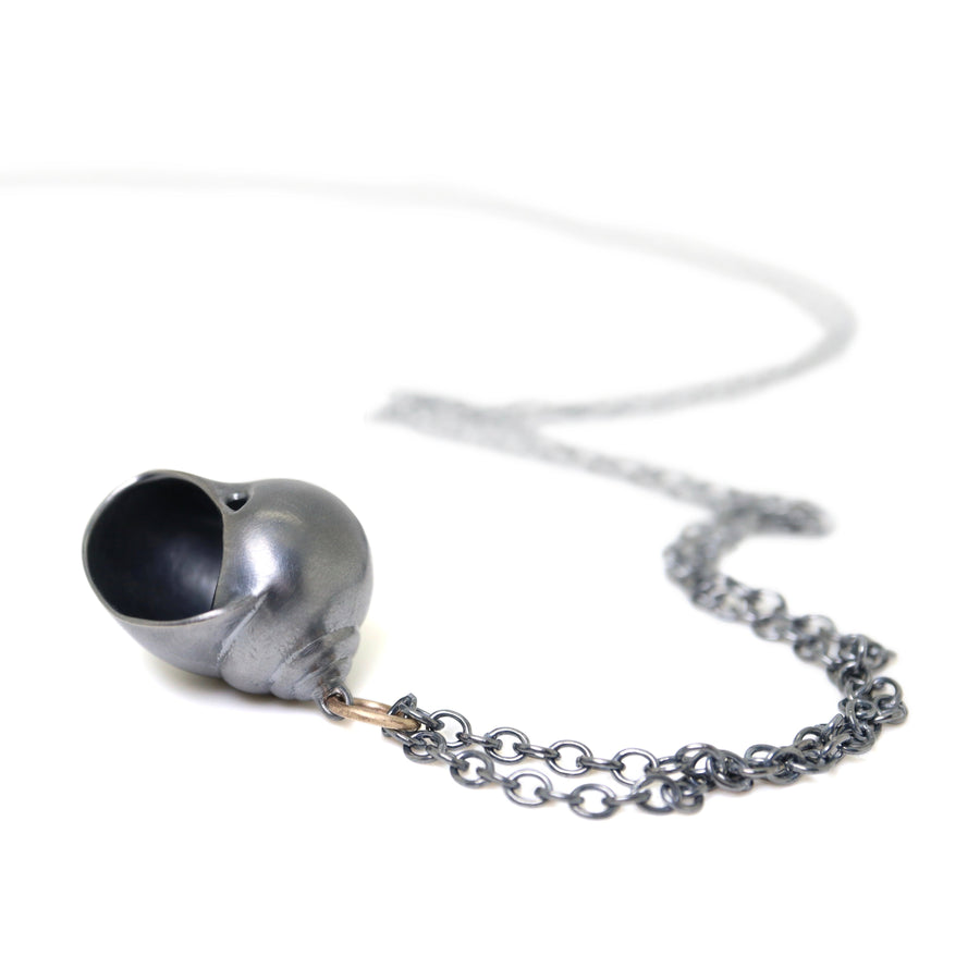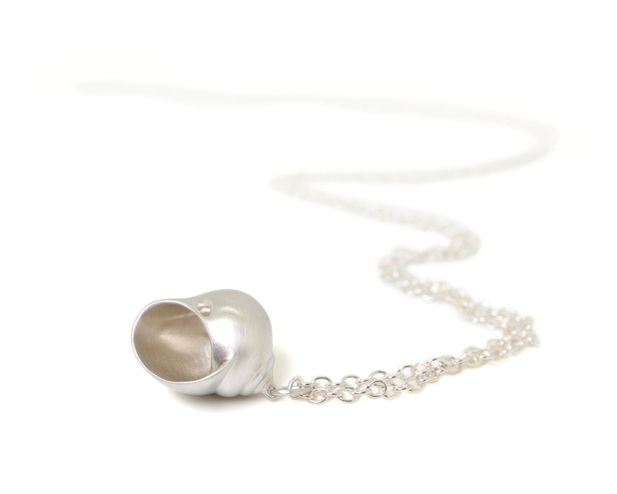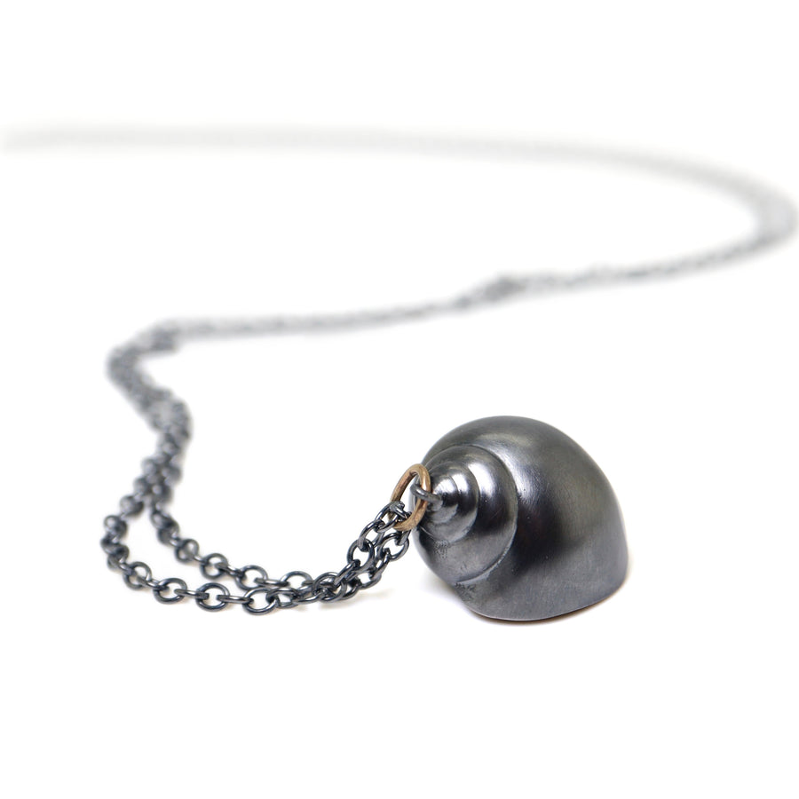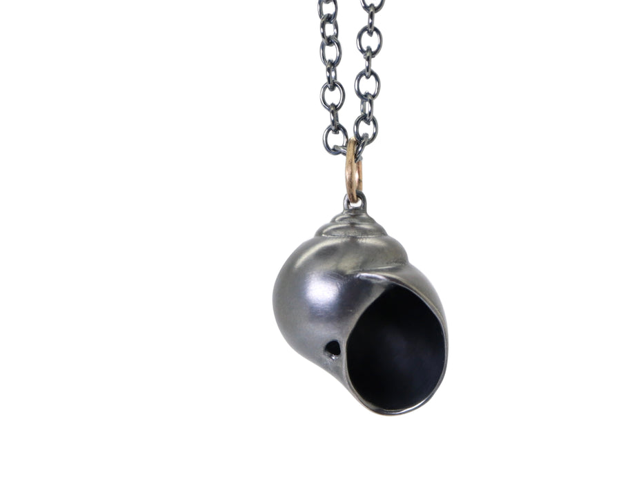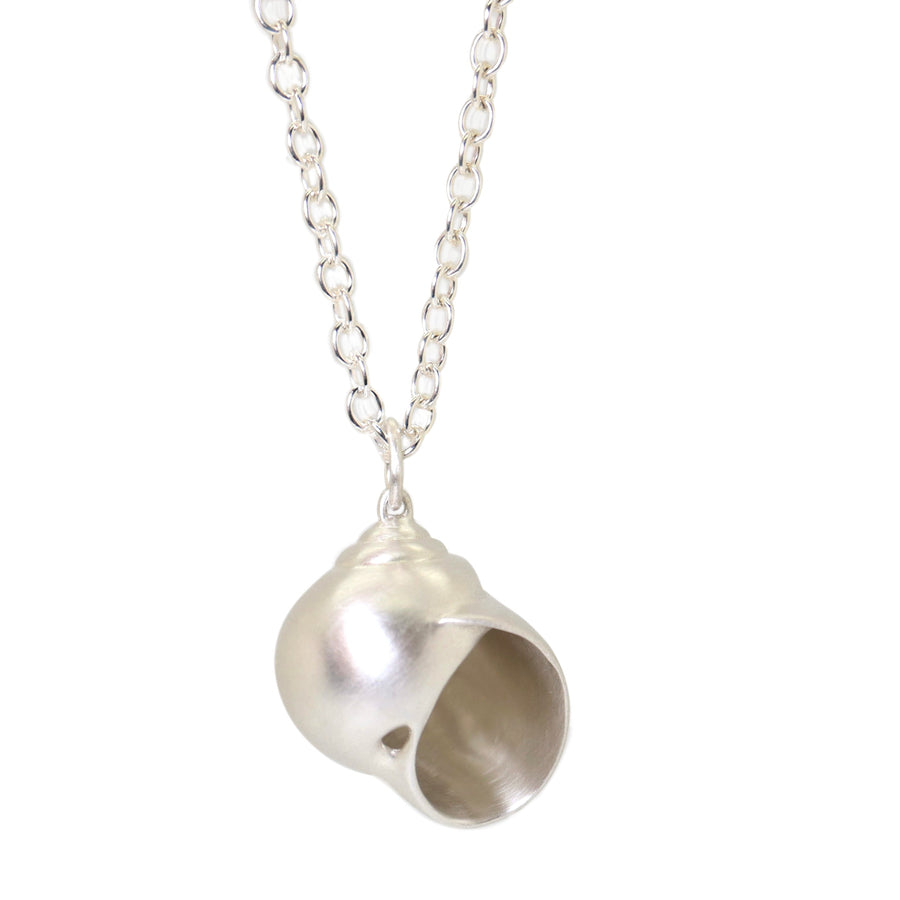 The luminous beams of a waxing moon and its spiraled light can be found under the sea and in this handmade, moon snail shell necklace. Fine metals enhance the intricacies and textures of the grand nautical pendant that hangs elegantly from a classic chain.