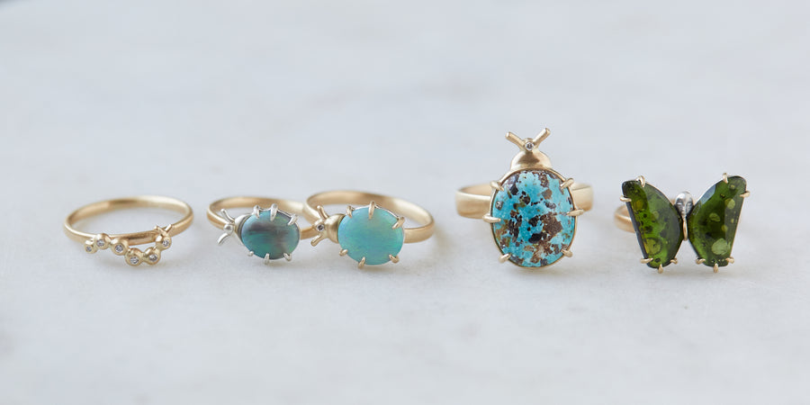 This budding capsule of organic amulets features insect-inspired rings, necklaces, and earrings amalgamated with classic HBJ designs. From butterflies to beetles, these new colorful creatures are comprised of lush tourmalines, Kingman turquoise, rare opals, sparkling diamonds, and many more beloved gemstones.
