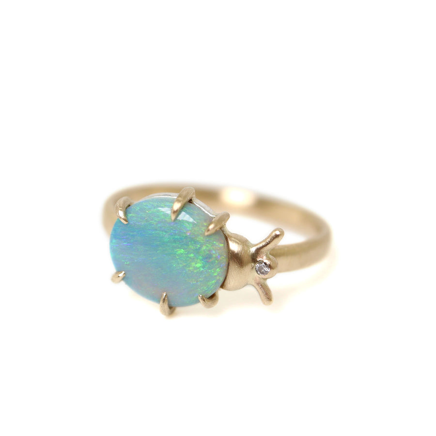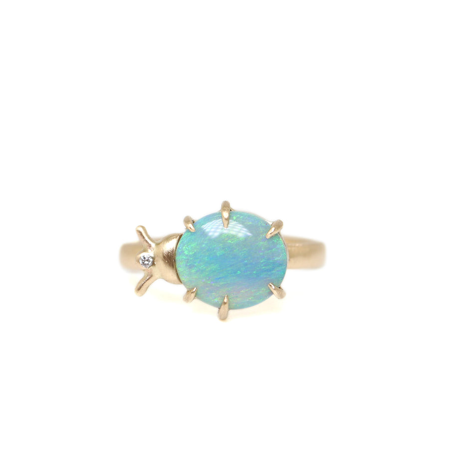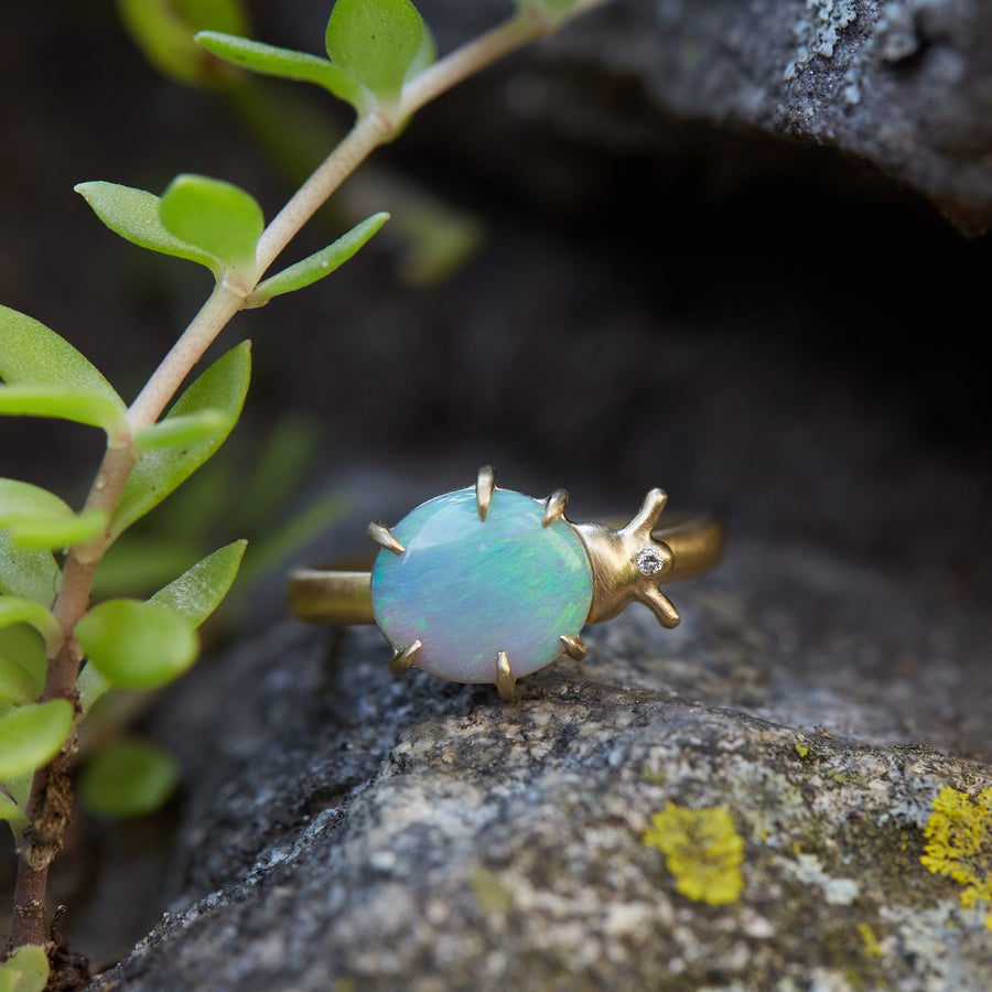 An azureous Lightning Ridge opal scuttles and shimmers with opalescence alongside elegant 14k gold and a single diamond adornment. This handmade, one-of-a-kind insect-inspired ring possesses the magic and mystery of a milkweed beetle.