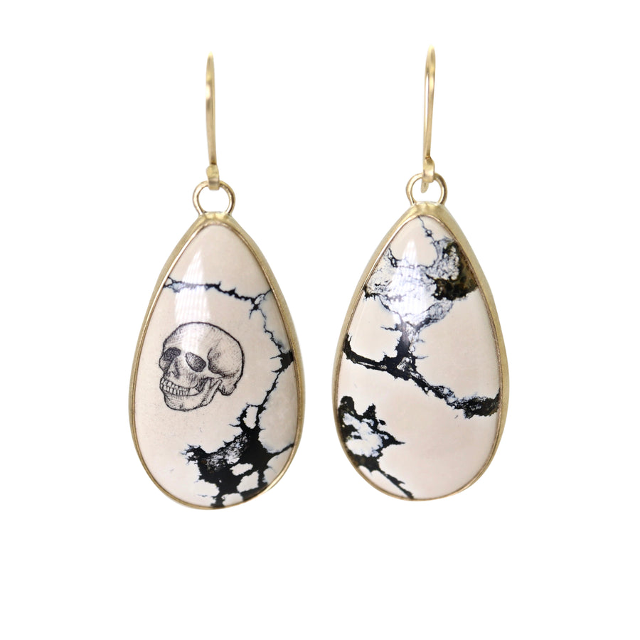 A single skull in India ink is adorned with thorny inclusions on earthy variscite drops in these handmade, one-of-a-kind memento mori Scrimshaw earrings. The striking earrings also feature an hourglass on the backside, evoking the mysteries of deep time and Mother Nature's ephemerality.