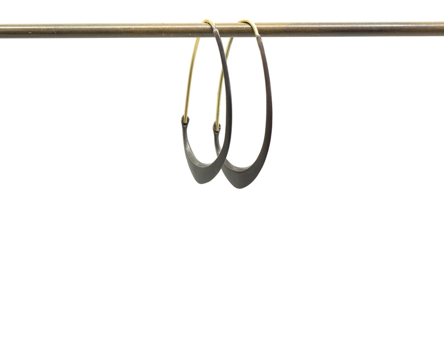 Solid oxidized (blackened) sterling silver hoops with 18k yellow gold ear wire components. Each hoop weighs approx. 1.6 grams.