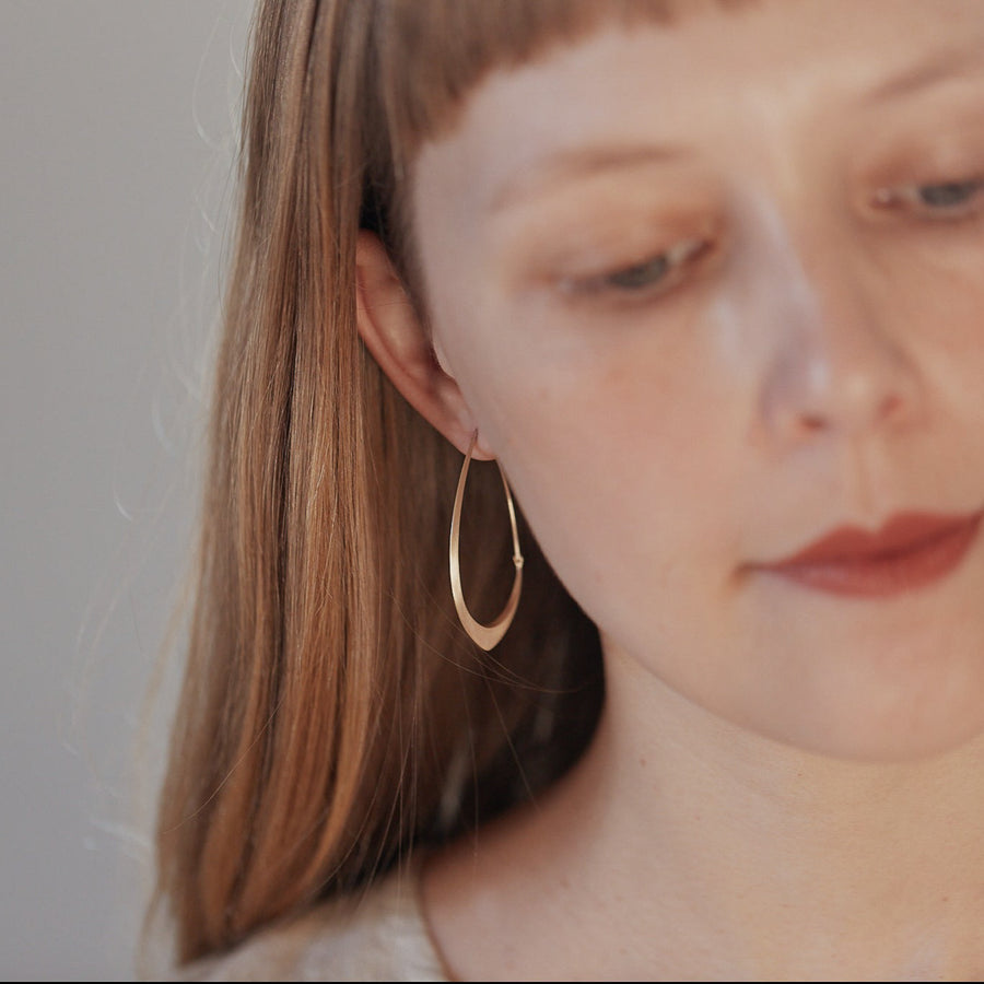 Sleek, sculptural, and effortlessly wearable, these hoops are a minimalist statement. Handmade in precious metals, these refined earrings honor the collection’s origins of geometric forms while embracing a streamlined, timeless silhouette. Universally flattering and designed for daily wear, these earrings are an elegant staple- because everyone needs the perfect pair of hoops.