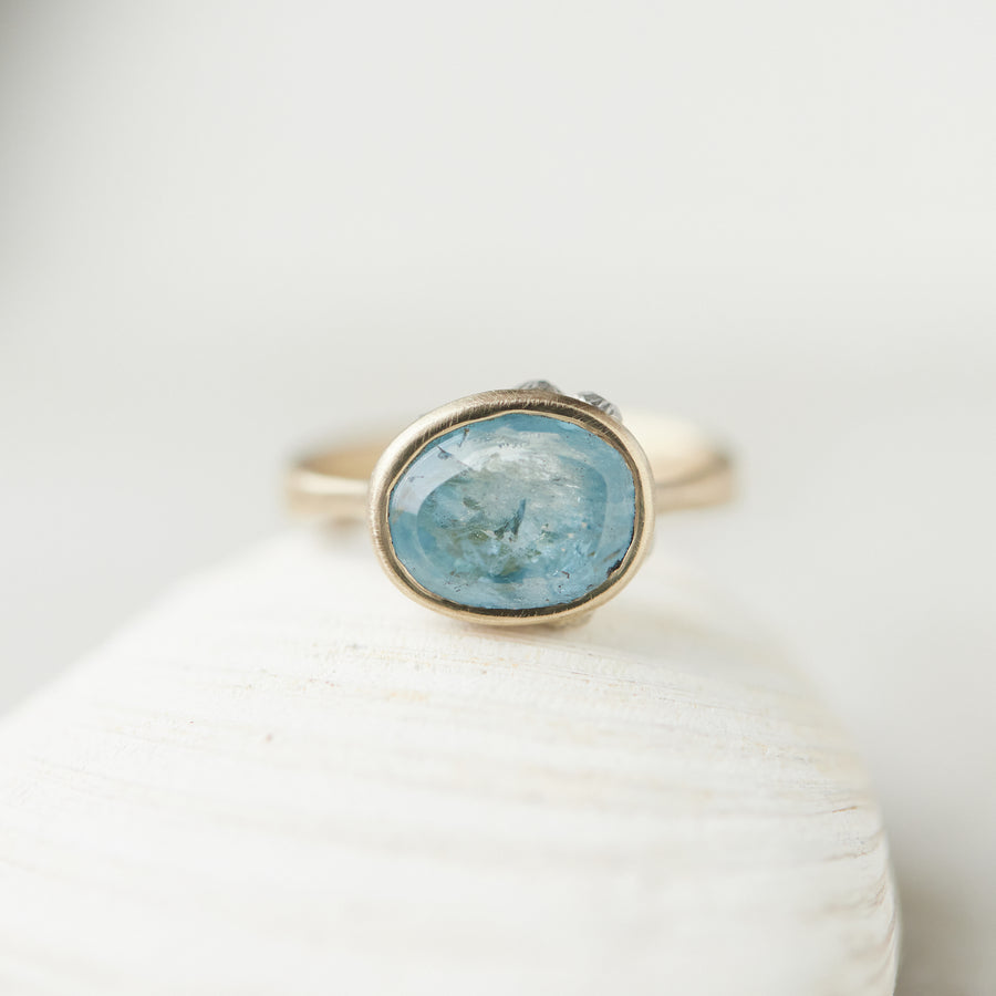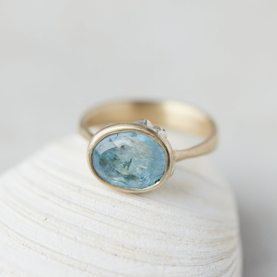 A cool, crisp aquamarine rests elegantly in a sculptural gold setting, its tranquil hue evoking the clarity of sunlit shallows. Within the gem, a myriad of intricate inclusions adds depth and movement, like ripples beneath a still surface. Little bright silver barnacles cling to the sides of the setting, reminiscent of the hull of an old canoe drifting through brackish water- a quiet nod to the passage of time and the beauty of life at the water’s edge.