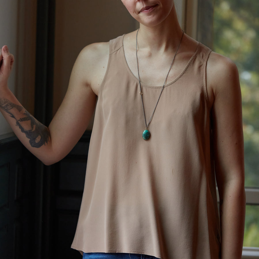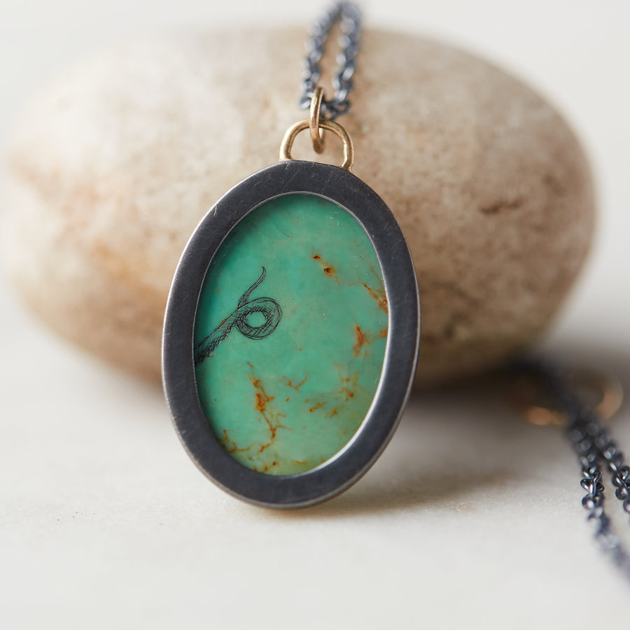 17.83ct hand-scribed Kingman turquoise Scrimshaw necklace. Available in oxidized sterling silver with 14k gold and India ink. Approximately 19x29mm. 28in infinity chain with egg motif details.