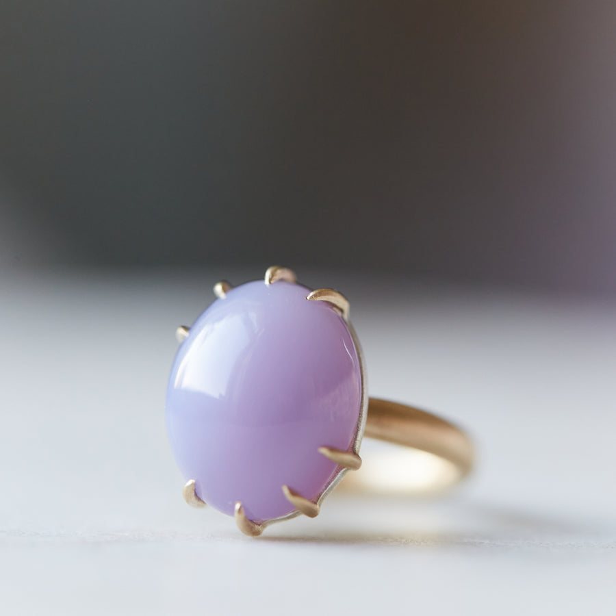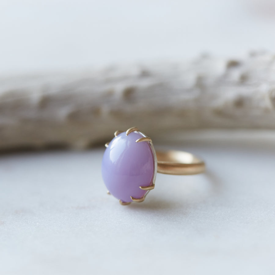 A lilac orb of chalcedony glistens under an aura of 14k gold prongs against a hammered band in this handmade, one-of-a-kind ring. The shades of a lilac bush's first blooms radiate in this glistening cabochon — full of ethereality and whimsy.