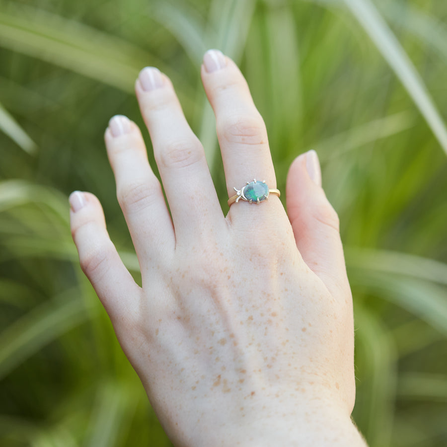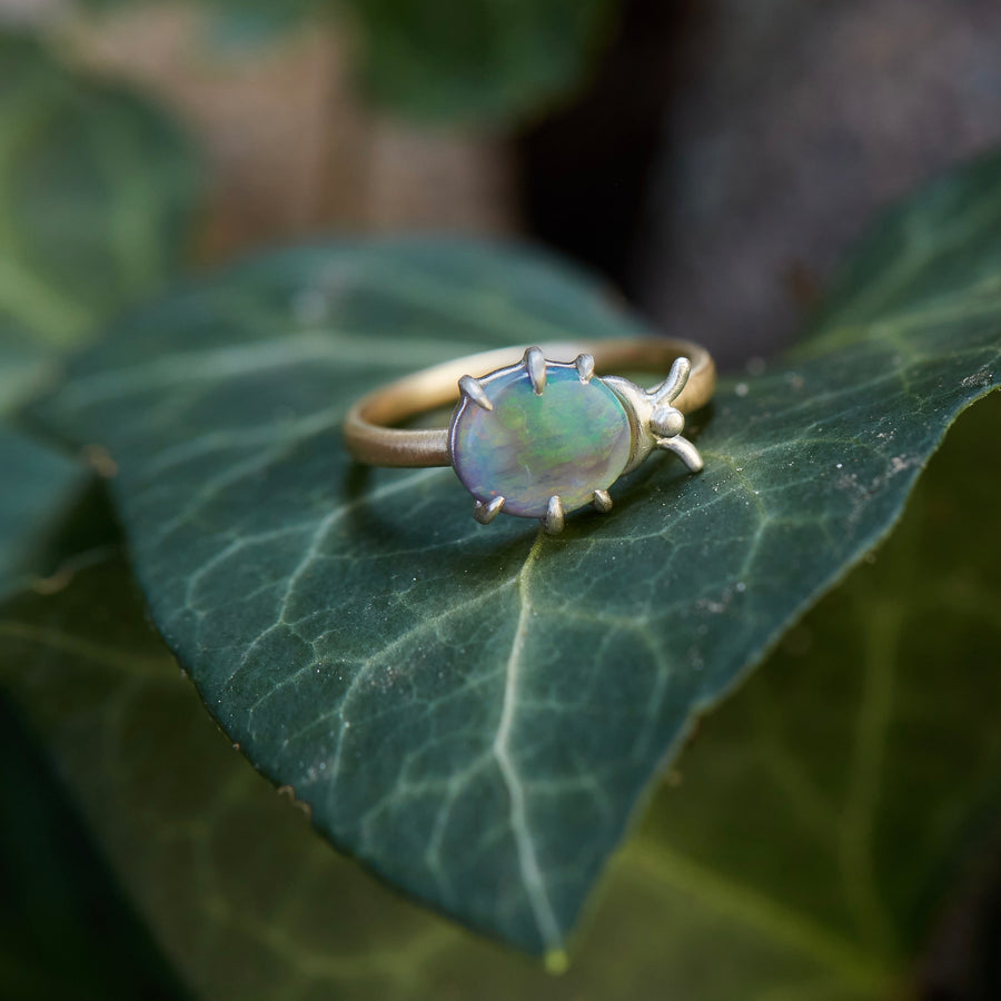 Whimsical, kaleidoscopic hues envelop a rare, Lightning Ridge opal in this handmade, one-of-a-kind insect-inspired ring. Flashes of green-blue are also found in the bioluminescent beetles that call the Cerrados home.