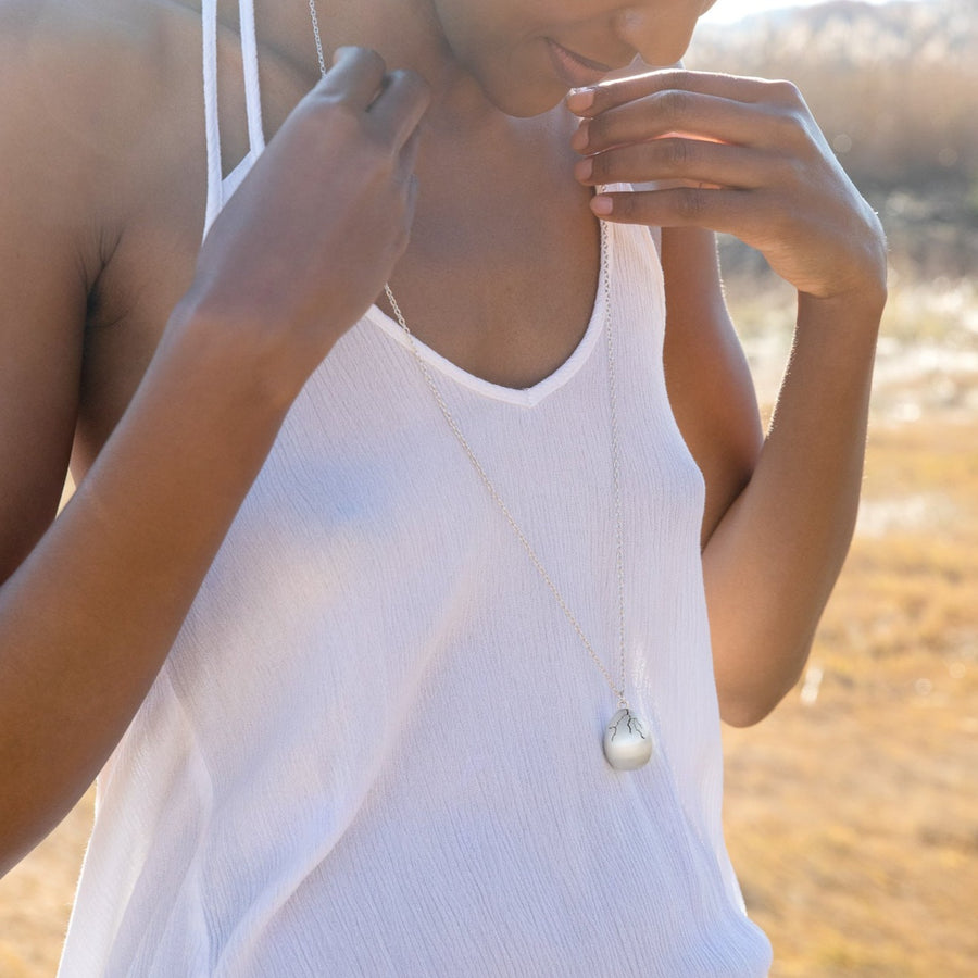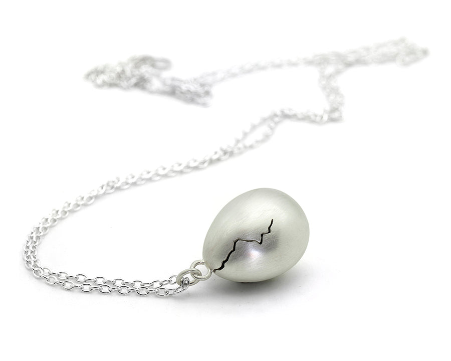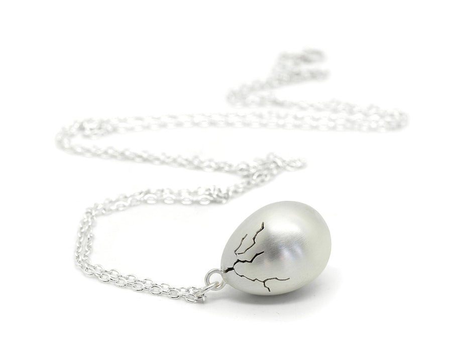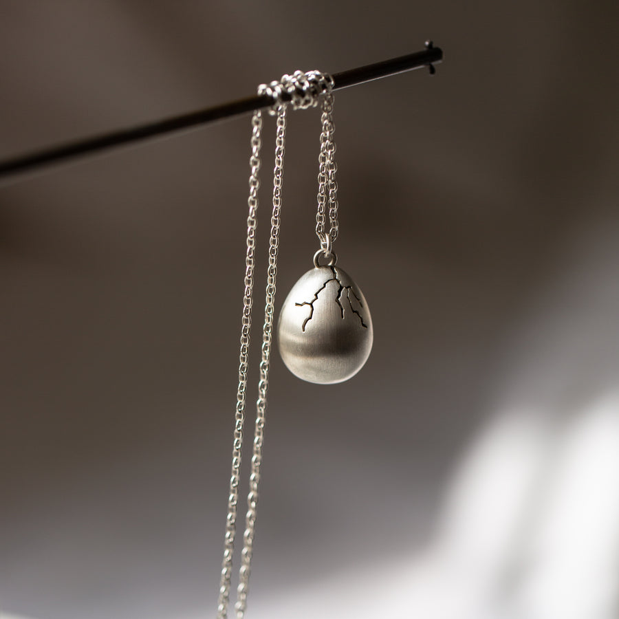 A tribute to nature’s organic artistry—the handmade egg necklace illustrates natural elements in contemporary, bright silver, creating a harmonious duality found throughout nature herself. The egg pendant features a myriad of cracks, as if a creature was ready to start anew from its shell casing.
