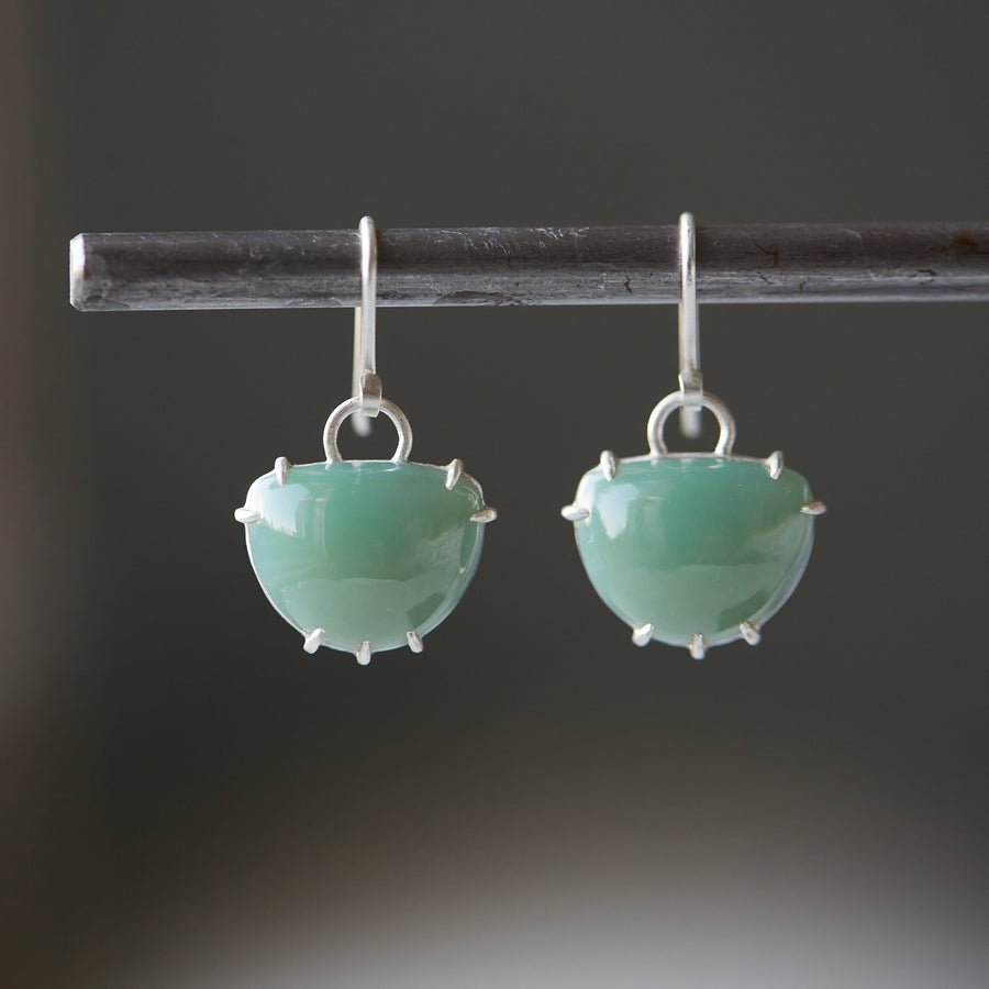 Dewy drops of chrome chalcedony hold a bouquet of daylily hues under argent prongs in these handmade, one-of-a-kind earrings. The lush drops feature a soft shield silhouette that enhances their botanical notes.