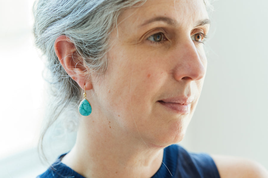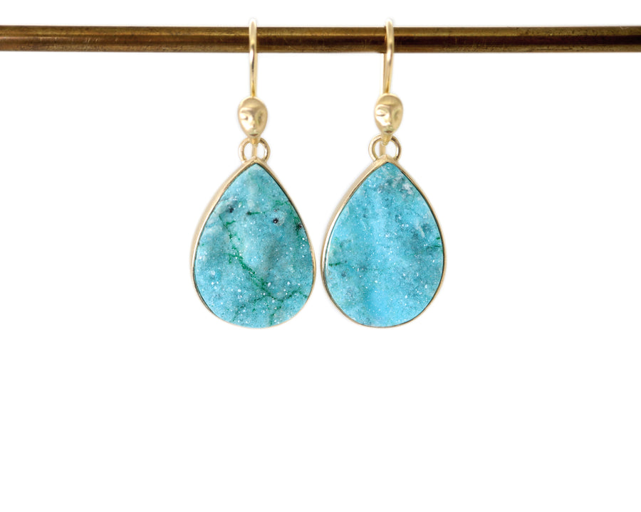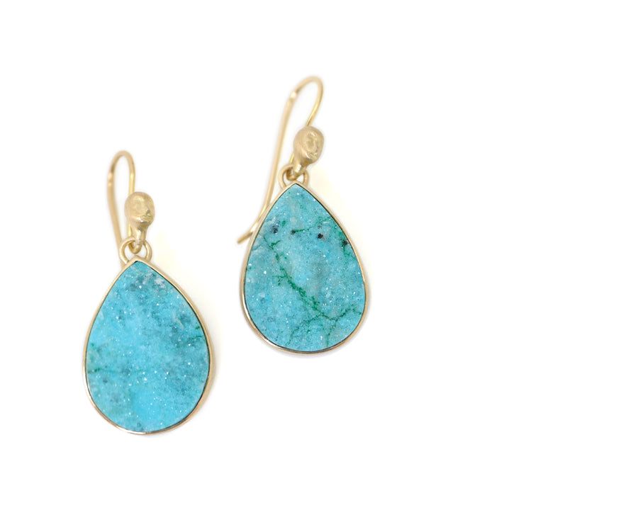 19.18ct drusy chrysocolla Cameo earrings. Available in 18k gold with bright fine silver. Approximately 15x23mm.