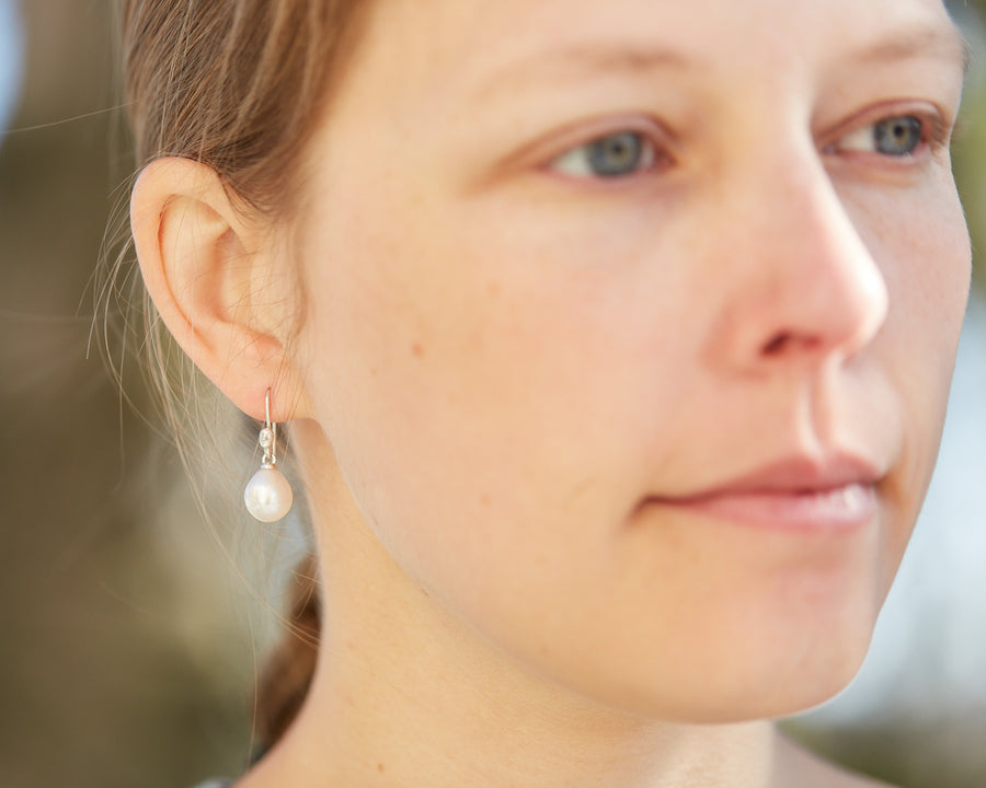 Angels descend from the proverbial heavens in this pair of handmade, limited edition Cameo pearl earrings. All the light in the cosmos radiates out from two iridescent pearls under argent, handcrafted Ladies. The shimmer and luster of each pearl evoke a moonbeam flaring down to Earth.