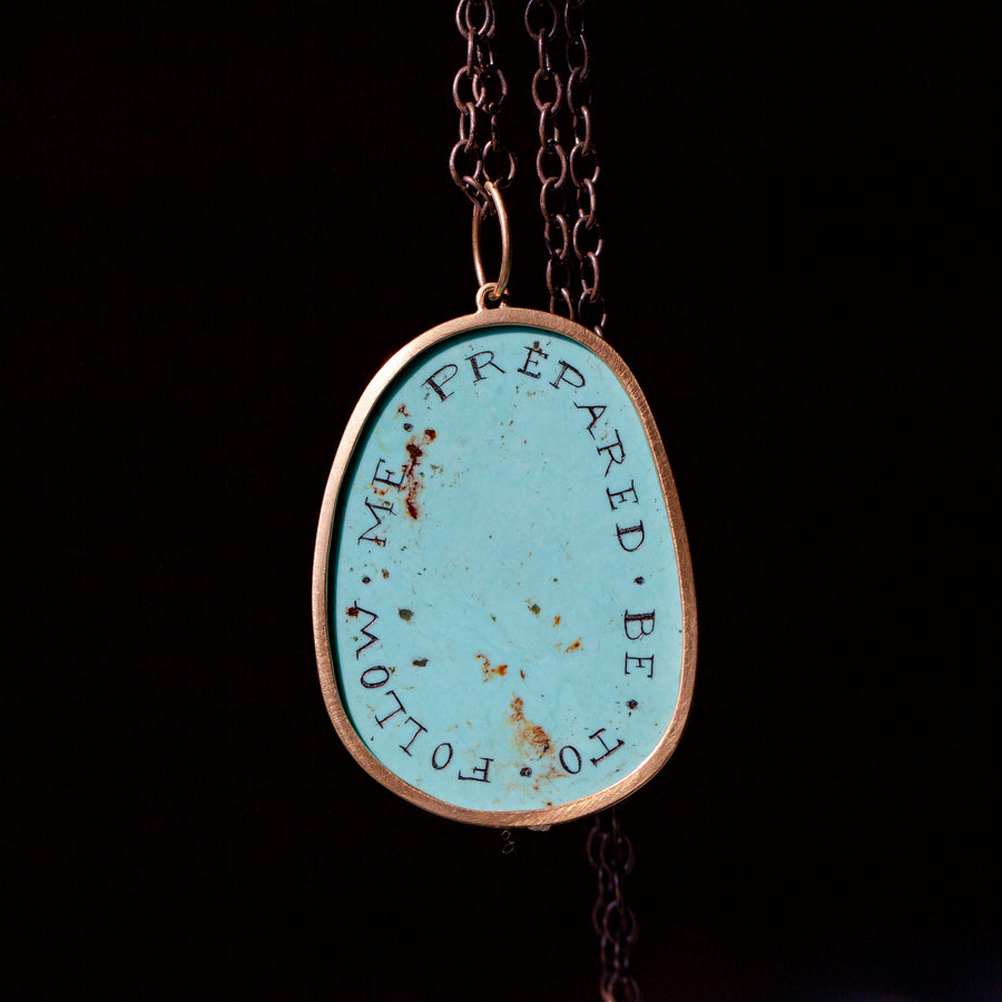 A singular statement necklace is composed of a grand, pastel Kingman turquoise pendant that holds a hand-scribed skeleton in India ink. The renown and gothic symbol of memento mori jewelry is engrossed by a bed of 14k gold, and enhanced by a stark, oxidized silver chain. The beautifully eerie epitaph Prepared Be To Follow Me appears on the back of the pendant, making the handmade, one-of-a-kind necklace wearable two-ways.