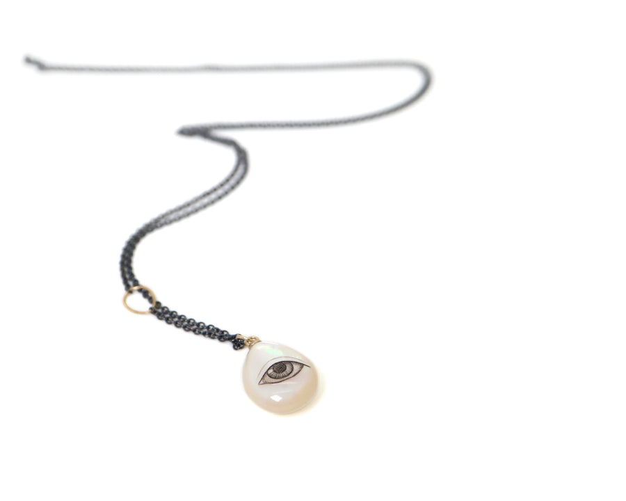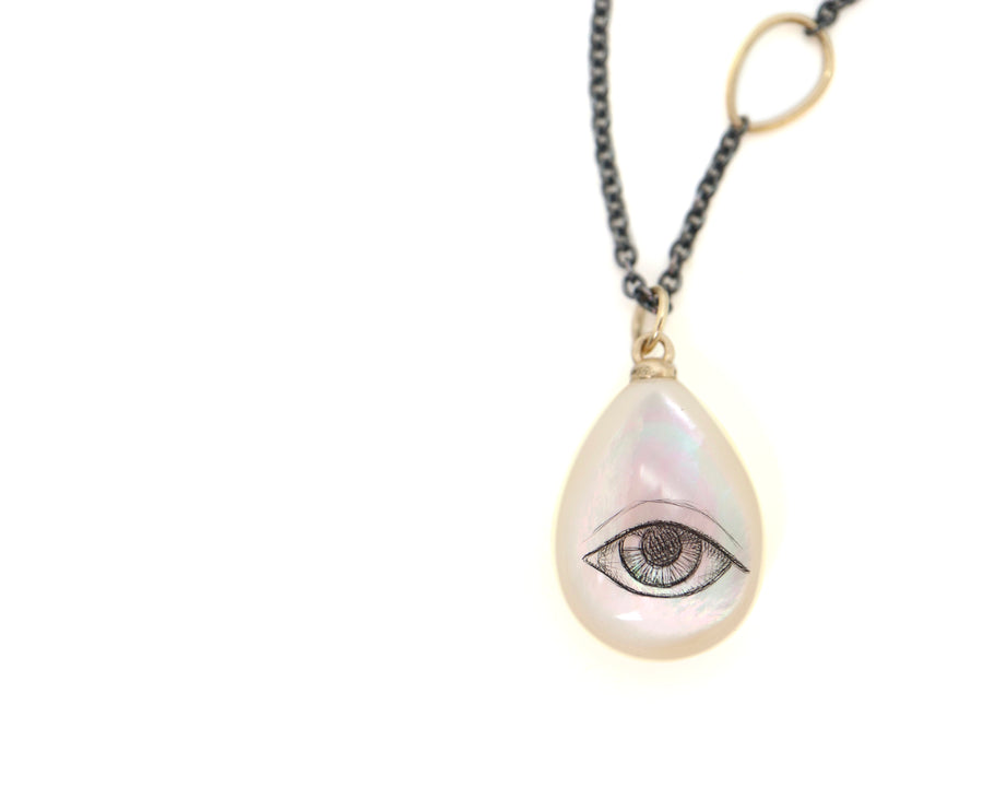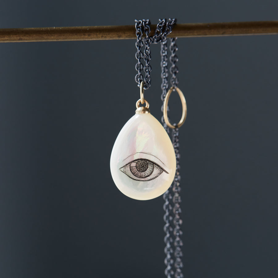 In these handmade necklaces, a tranquil Lover's Eye spots their heart's desire from a teardrop of shimmering mother of pearl. Hand-etched illustrations demonstrate the effect of spotting your loved one from across a room: dilated pupils and a glint that evokes the spark of love.