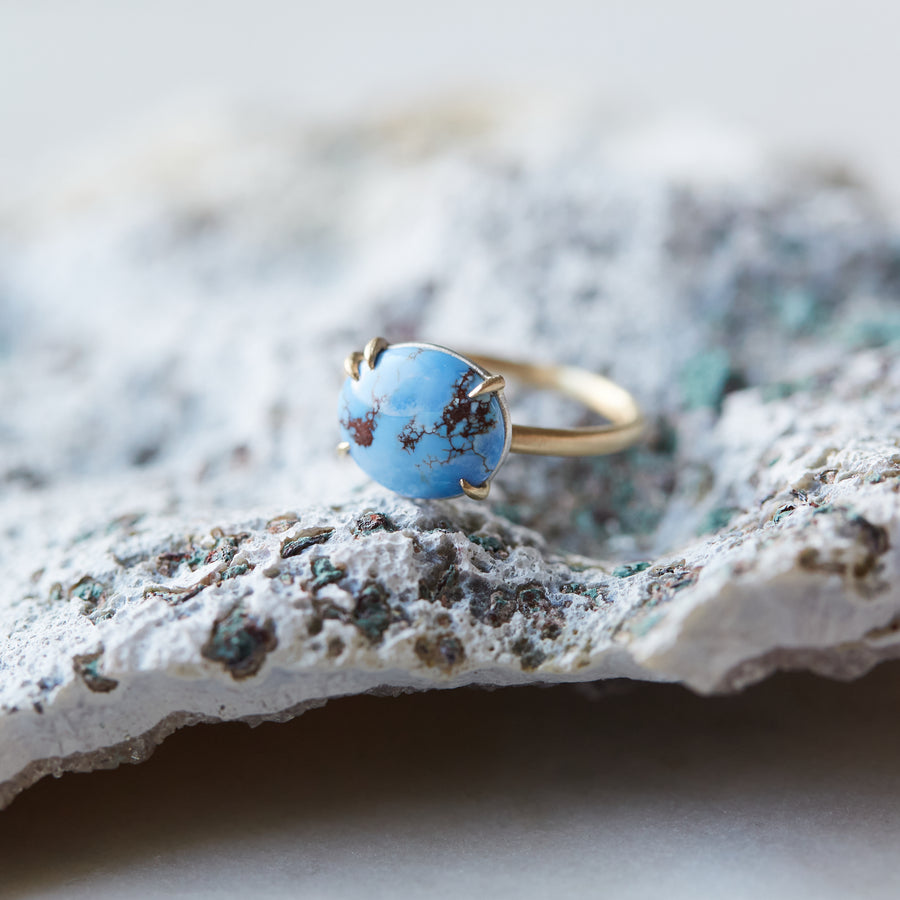 A talisman for self-trust, this handmade, one-of-a-kind Vanity ring posses rich inclusions and ephemeral blue hues in a gritty prong setting. The lush hues and singular inclusions that permeate the organically refined cut of Kazakhstan turquoise enhance the detailed beauty of the classic Vanity design.