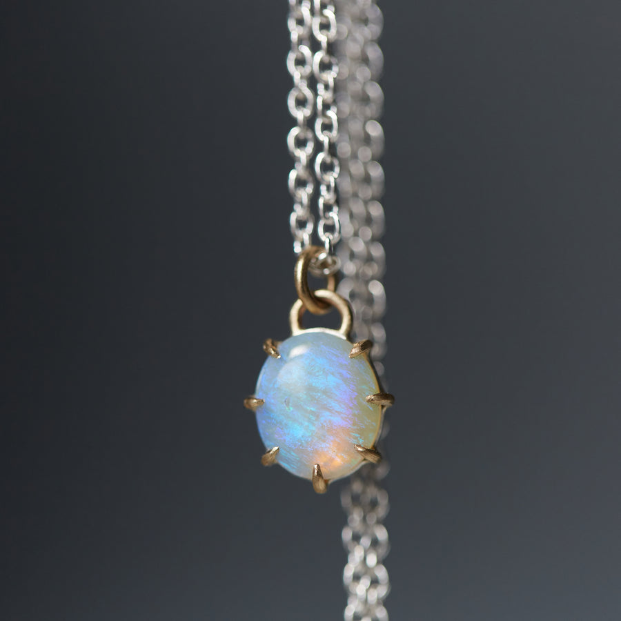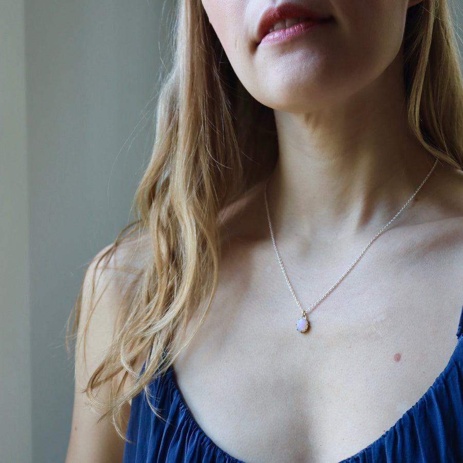 An ode to the fantastical world of the fae, this handmade, one-of-a-kind opal necklace combines the cool hues of the celestial—including bright sterling silver and aerial hues—with sunshine warmth. A halo of 14k gold Vaity prongs illuminates the Lightning Ride opal's vast colors. A necklace fit for A Midsummer Night's Dream...