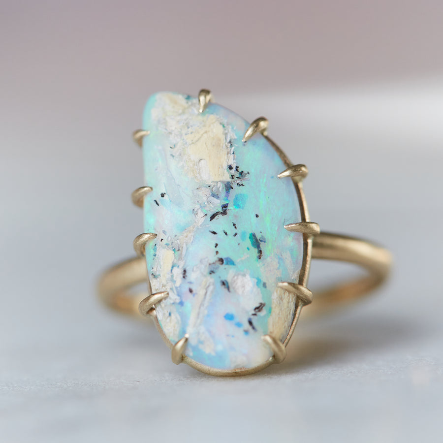 Care: All opals are fragile like glass: be extra careful to avoid abrasive surfaces, and avoid knocking your opal against hard surfaces. Extreme temperature shifts can cause cracks. To keep your opal clean, use warm water with mild soap and a soft toothbrush or cloth. Do not use a steam cleaner or ultrasonic cleaner.