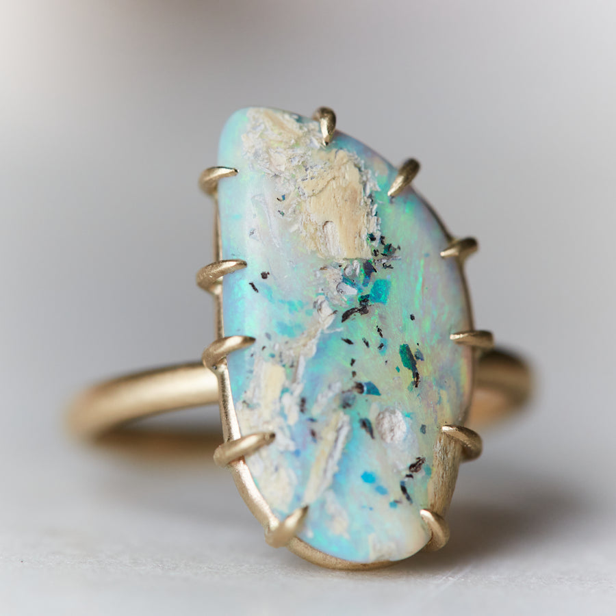 A raw, fossilized wood Lightning Ridge opal ring holds pockets of vibrant colors like an opalescent illusion of wonder. This handmade, one-of-a-kind opal ring is composed of 14k gold prongs and a hammered band, evoking the bright warmth of the sun's rays trying to reach the moon. Evoking the magic and mystery of the fae, the moon, and nature's own uncontainable beauty, this ring is fit for the Celtic goddess Rhiannon herself.