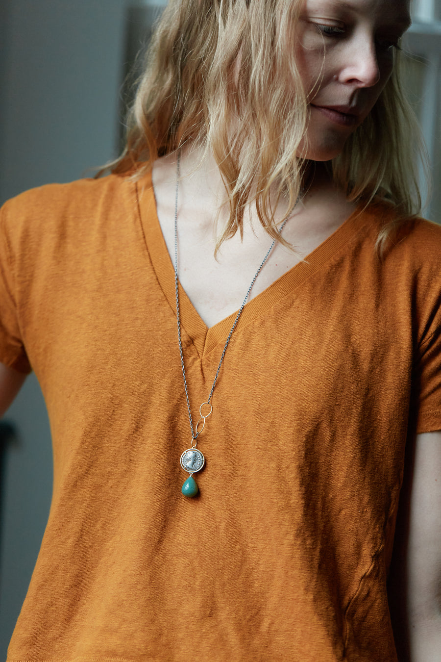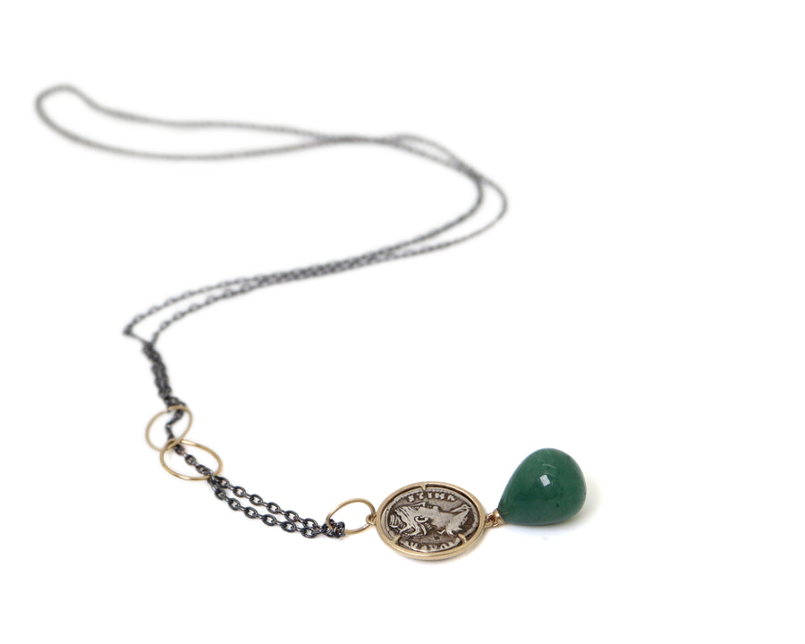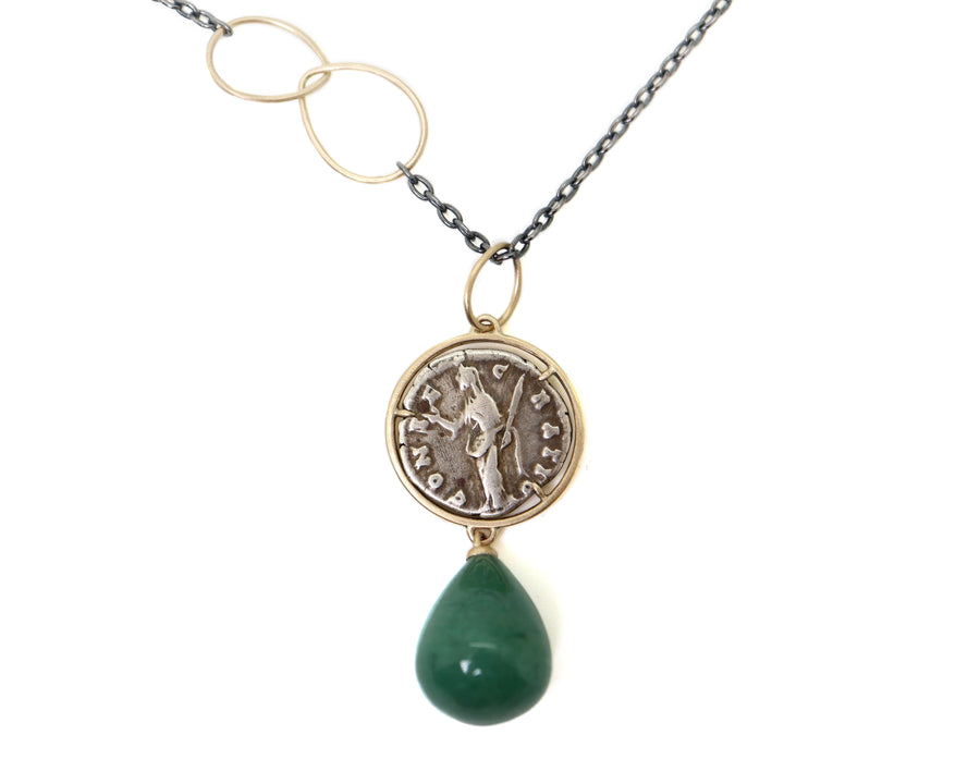 Ancient silver Denarius coin and aventurine pendant Vanity necklace. Available in oxidized silver with 14k gold. Approximately 20x41mm. 28in infinity chain.