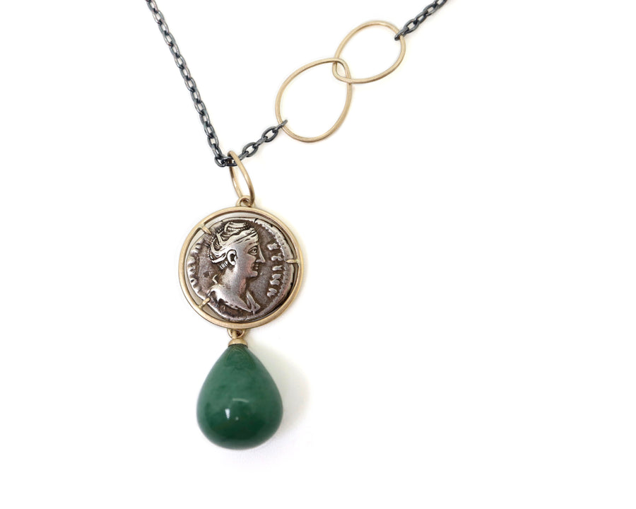 An ancient coin issued between 148 to 150 CE finds new life atop a rich drop of lush aventurine in a classic Vanity collection setting. The detailed texture of the ancient coin, and its warm 14k gold accents, enhance the figures depicted on both sides of this reversible necklace: Empress Faustina the Elder and the goddess Ceres