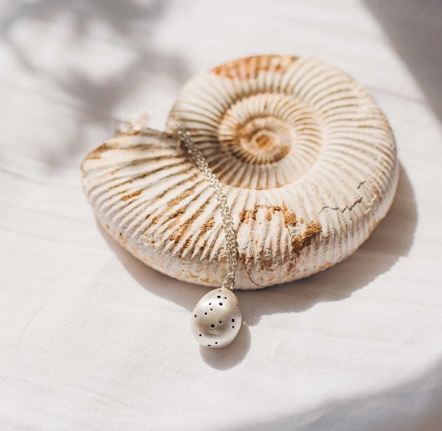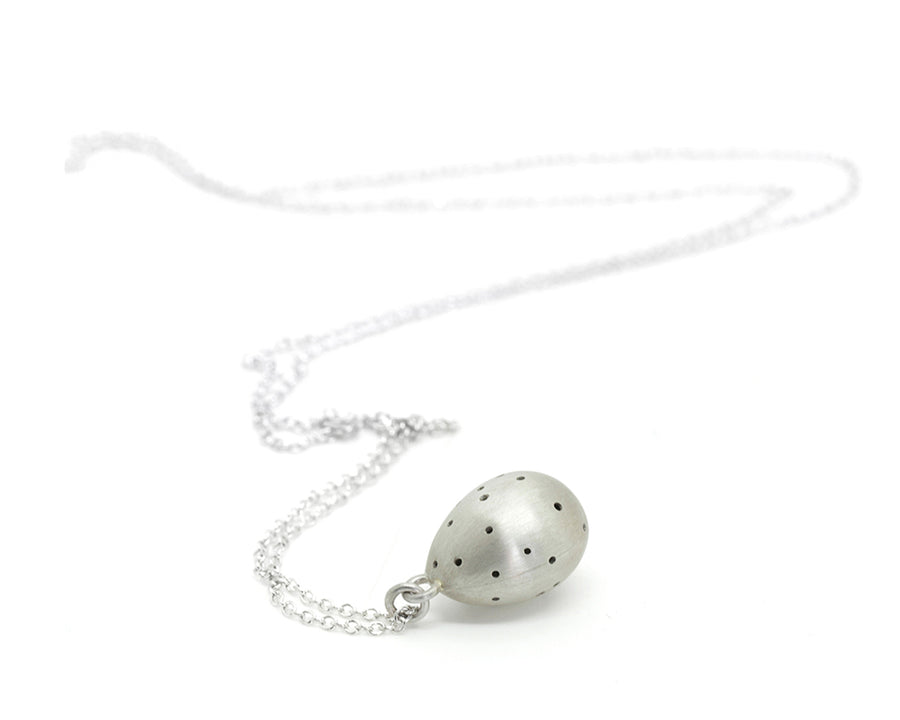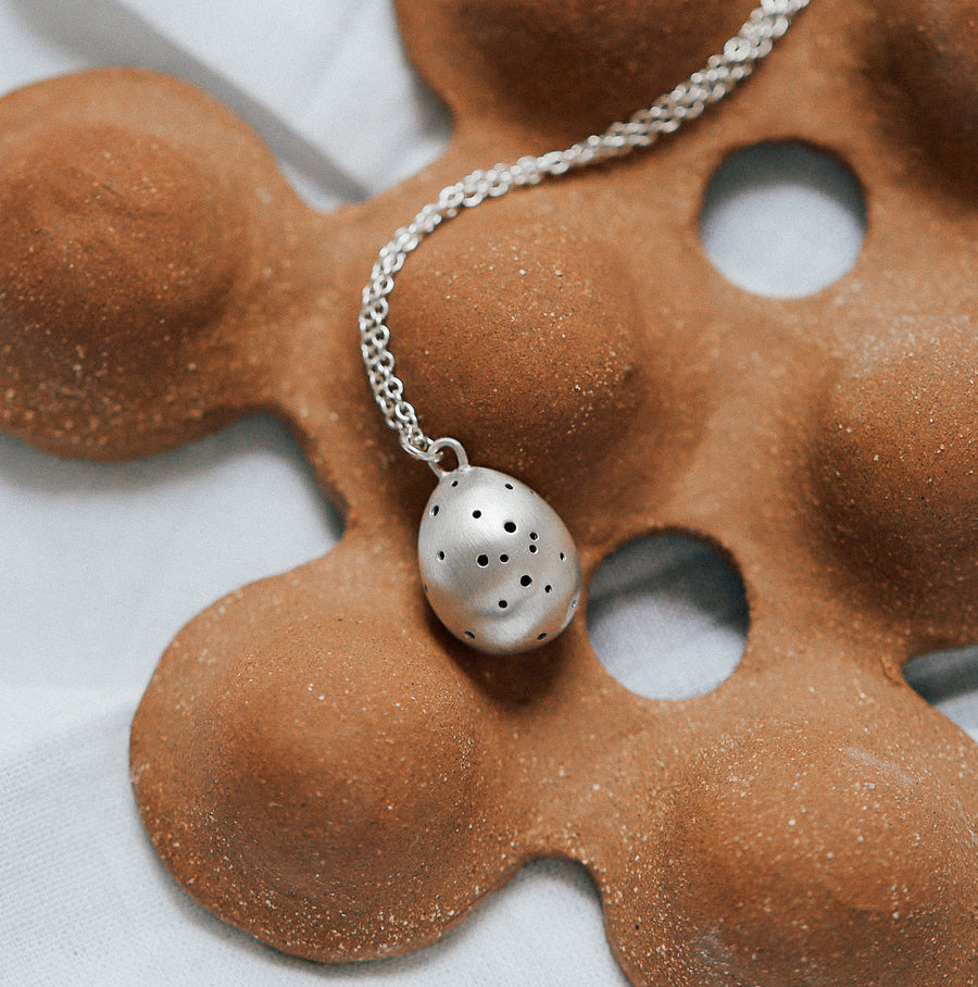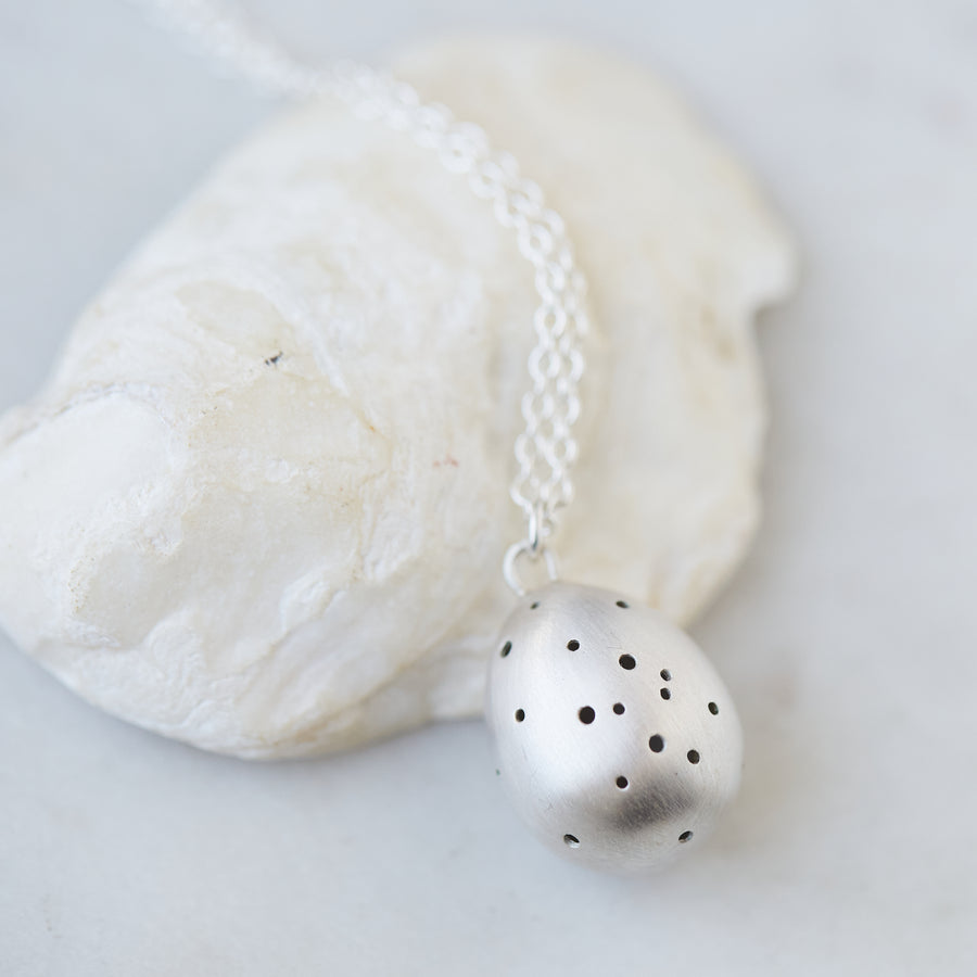 A curious little bird egg is speckled with a myriad of tiny holes, harboring burgeoning energy and change. A talisman for new beginnings, this handcrafted necklace embodies the beauty of life's first stages and the mystery of horizons not yet explored.